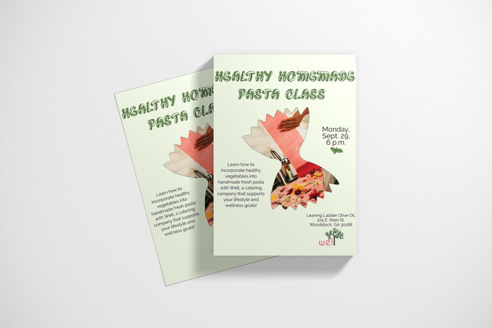 My vision for Well starts in Woodstock, GA, my hometown, a community-driven place that is also artsy, hip, and trendy. I wanted the designs to feel whimsical and welcoming, reflecting Woodstock’s creative, nature-loving spirit while appealing to both millennials and older generations. The family tree or picnic basket imagery emphasizes connection, nourishment, and life events, highlighting Well as more than just a caterer—it's a lifestyle brand focused on meal support. I chose shades of green to convey health and freshness, complemented by raspberry accents for brightness, energy, and a nod to summer, family, and the lake—elements that embody Woodstock’s cheerful, earthy vibe. For the font, I selected a clean, easy-to-read style with a modern touch that balances the detailed imagery in the design.